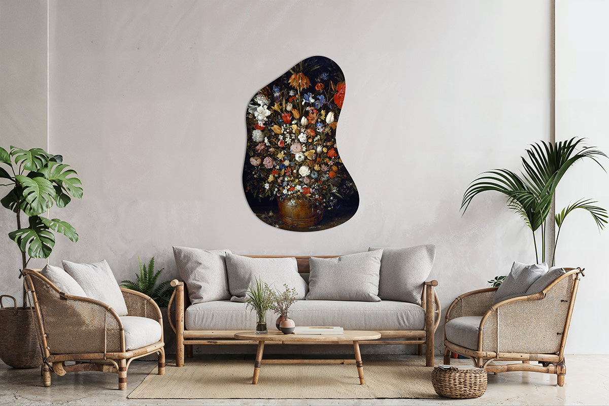 This painting of beautiful flowers in a wooden vase or barrel was made by Jan Brueghel the Elder around 1620.