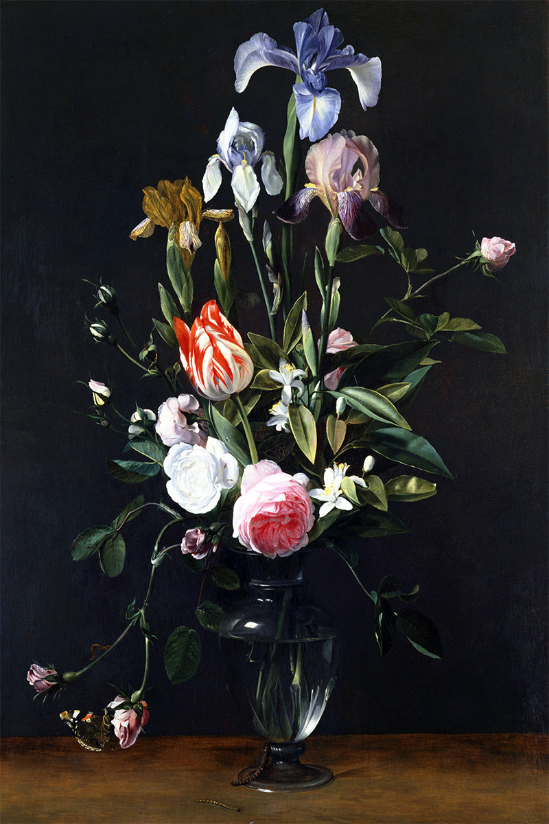 A beautiful work of a bouquet with different flowers in a glass vase. This artwork was made by Daniël Seghers in 1635.