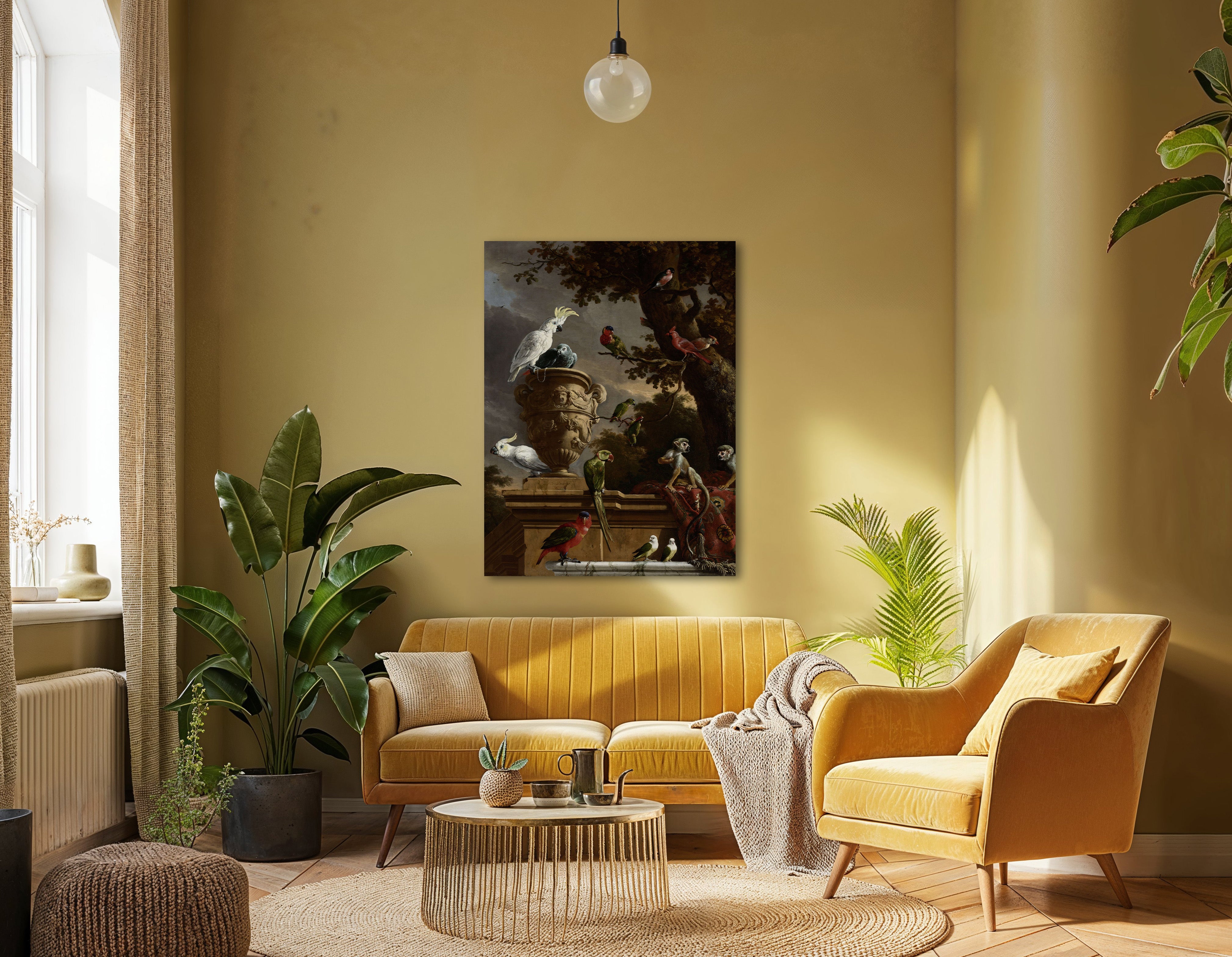 A work of art by Melchior d'Hondecoeter, made around 1690. This work features two squirrel monkeys from Central America, two white cockatoos with sulphur from Australia, a grey parrot from Africa and a purple snapped lory - on a chain on the left lower left - from Indonesia. Hondecoeter combined these creatures and a number of other beautiful birds in this painting, which was intended for Het Loo, the palace of William III. It hung above the door of the king's private apartment.