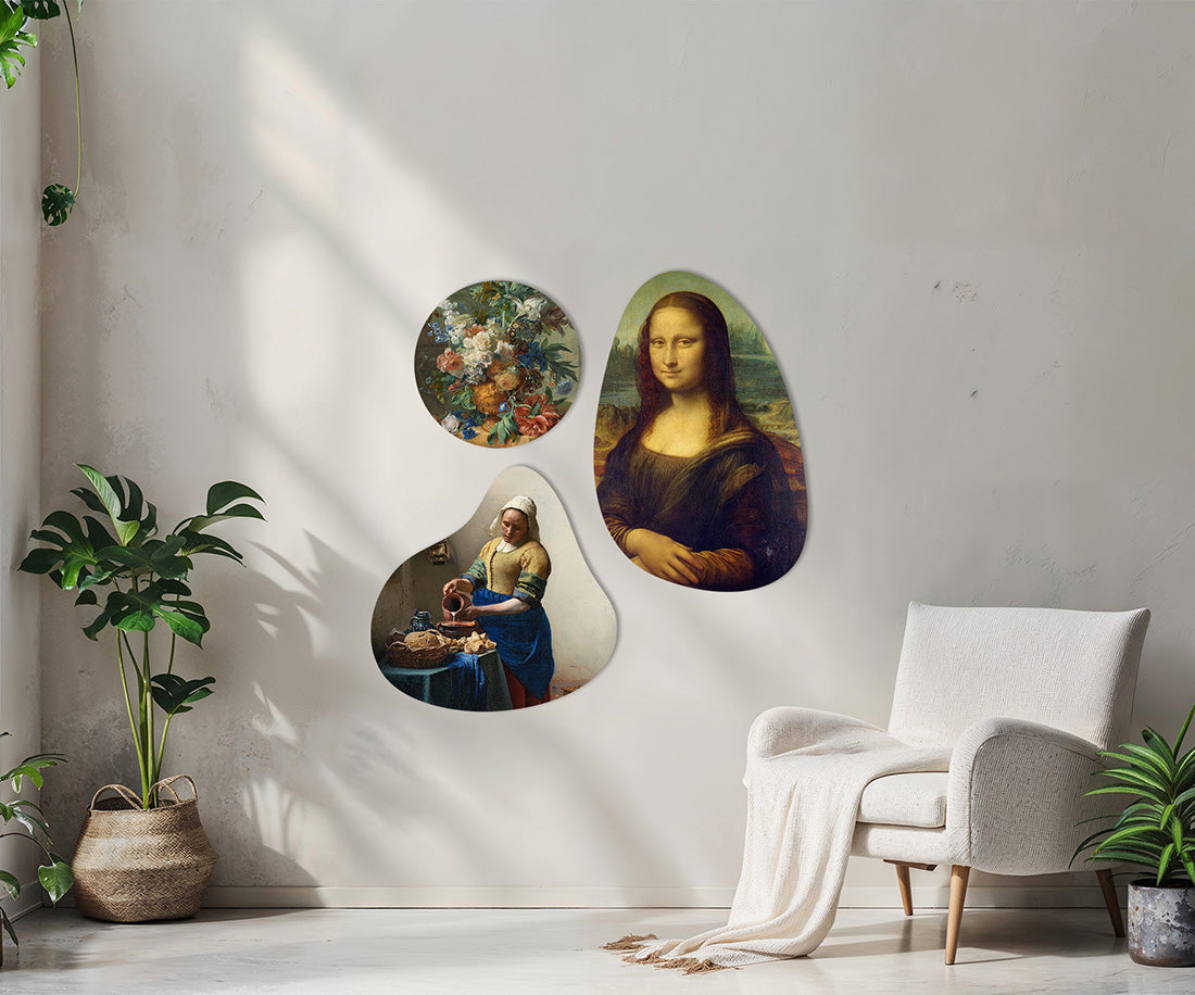 Een set van verschillende beroemde meesterwerken. Het Melkmeisje van Johannes Vermeer (c.a. 1660), de Mona Lisa van Leonardo da Vinci (c.a. 1503) en een prachtig bloemen schilderij van Jan van Huysum (c.a. 1723).